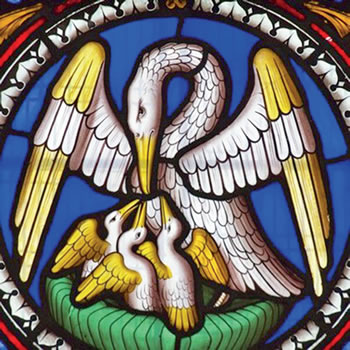 It was during the medieval period that we first encountered the pelican used as a Christian motif. According to legend, the mother pelican feeds her chicks from blood pecked from her own breast (a belief based on the habitual way a pelican shields its famous long beak in its front parts). Early Christians saw in this a metaphor for the Paschal Mystery and Eucharist of Jesus: just as the mother pelican gives life to its offspring by the shedding of her blood. So, Christ redeems God’s children by the shedding of HIS blood and gives them eternal life through the receiving of His blood at communion time.